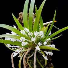 • Hojas: Las hojas de esta orquídea son alargadas, finas, y de color verde brillante. Son coriáceas y resistentes, dispuestas a lo largo de los tallos. Tienen una textura que les ayuda a adaptarse a su entorno, conservando la humedad en las condiciones ambientales más secas.