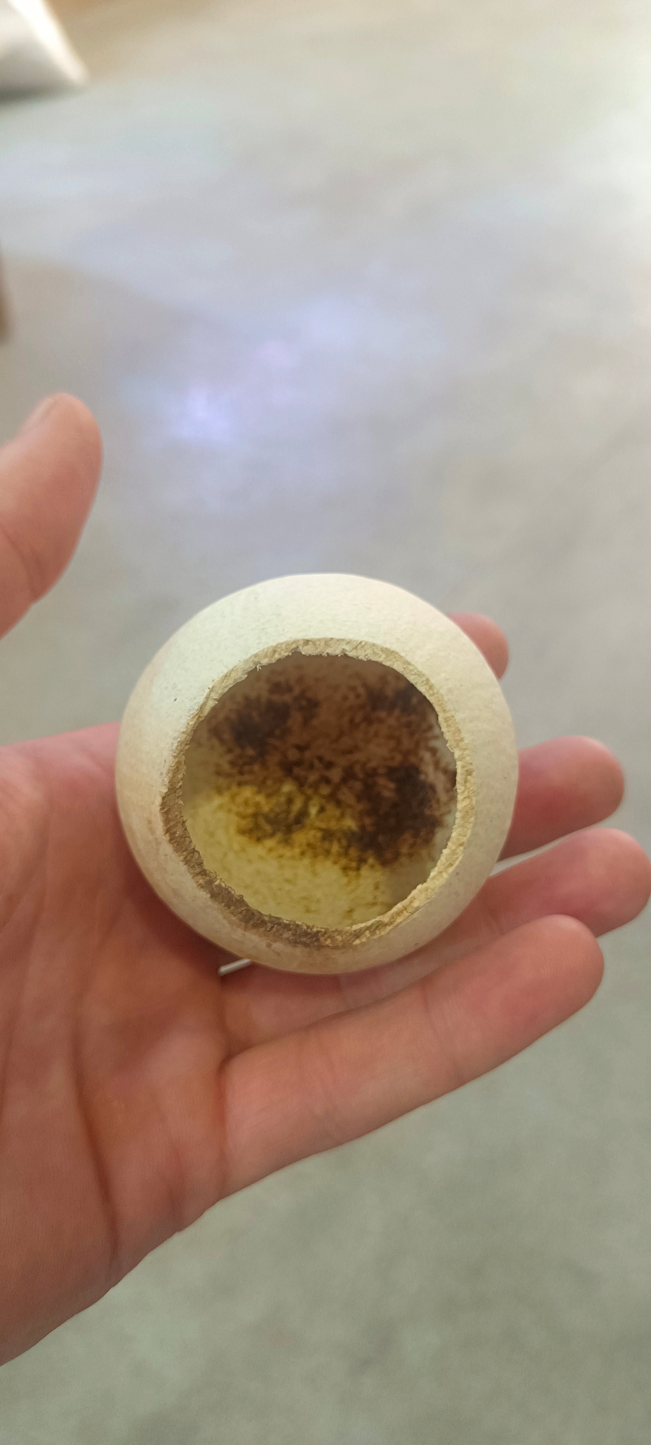 Cáscara: Leñosa, gruesa (3–5 mm), muy dura al madurar
