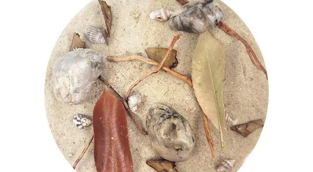 Al mezclar y equilibrar cuidadosamente los materiales naturales, que incluyen piedras claras y lisas, hojas oscuras y de colores claros, ramitas y ramas pequeñas y conchas diminutas en tonos claros y oscuros, junto con arena suave y pálida, nuestro objetivo es mostrar el equilibrio natural de los materiales orgánicos.