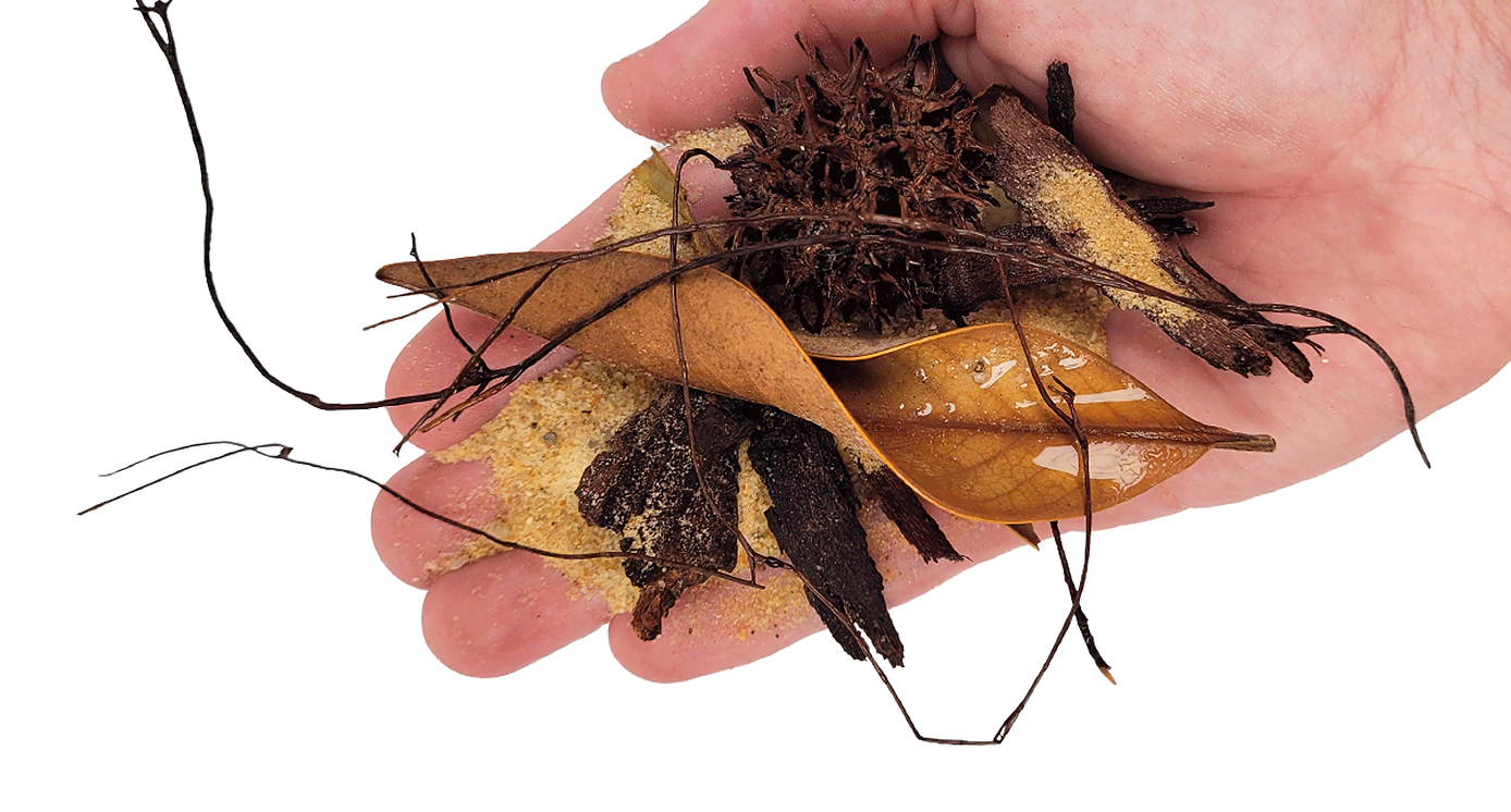 Un sustrato de auténtico 'estilo natural' con vainas de semillas secas de América del Norte, hojas de magnolia, hojas trituradas y trozos de madera caídos y raíces diminutas que sugieren el bosque a lo largo de las orillas del río. Este sustrato de 'estilo natural' es exactamente el tipo de matriz de materiales orgánicos y arenas que puede encontrar en una variedad de hábitats, pero especialmente en ríos y pantanos de tierras bajas, donde las corrientes lentas permiten que las hojas, ramitas y otras materias primas se hundan hasta el fondo. abajo, donde brindan refugio y oportunidades de alimentación para innumerables animales.