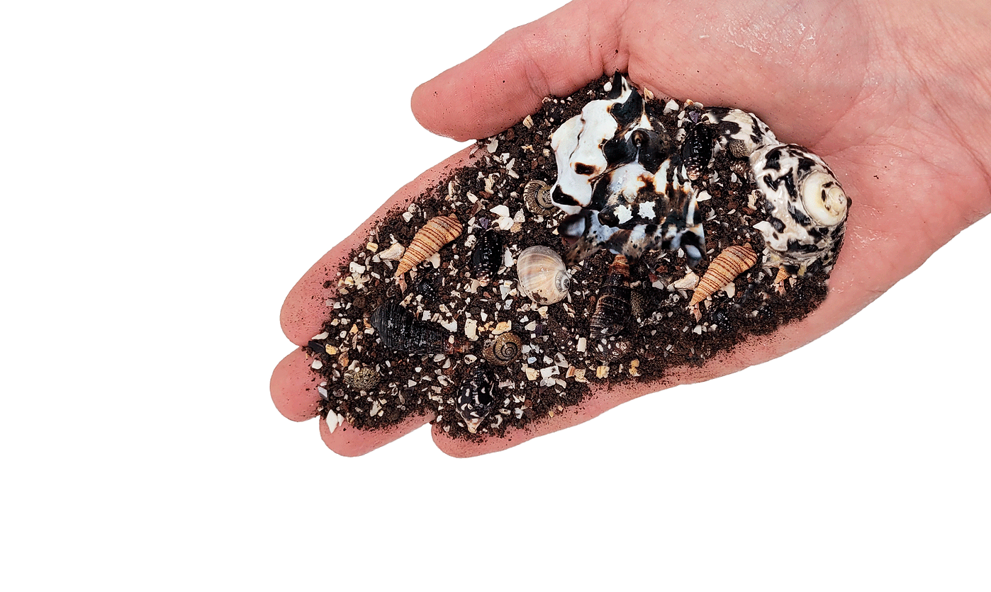 Esta versión oscura se inspiró en las imágenes del lecho del lago Turkana en África y en las mezclas de arena y caracoles negros que se encuentran en los arroyos y zanjas de los humedales del Pantanal de Brasil