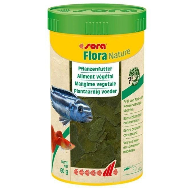 Sera Flora Nature es el alimento vegetal para todos los peces ornamentales herbívoros, que se alimentan en la superficie, sin colorantes ni conservantes. Gracias a los ingredientes naturales, ricos en fibras, como espirulina con alto contenido de carotenoides, el alimento asegura una digestión saludable y aumenta la vitalidad. La fórmula fácil de digerir, con un alto contenido de proteínas vegetales, también es idónea para los peces debilitados que, por ejemplo, se están recuperando de una enfermedad del aparato digestivo. Las escamas mantienen su forma en el agua y no enturbian el agua.Pienso completo para peces ornamentales